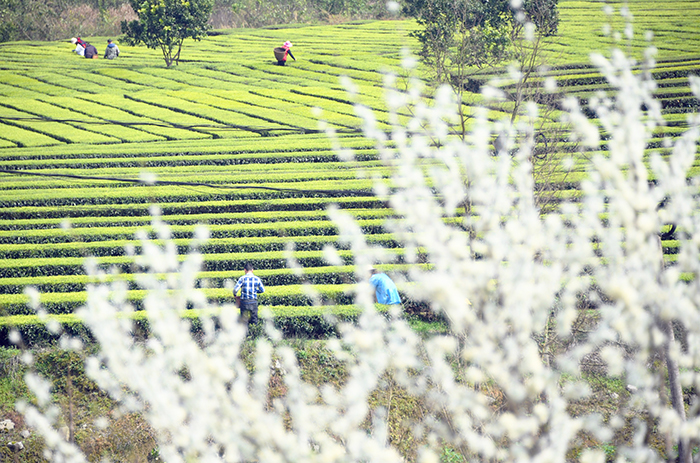 仲春时节,宣恩县25万亩春茶进入采摘期。当地在做好疫情防控工作的同时,组织茶农采收春茶供应市场,防疫生产两不误。 (本报恩施图片库 王 俊 摄)