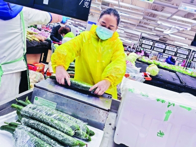 18日上午,中百仓储长丰店,店员正在给黄瓜包上保鲜膜,再打包进特价蔬菜包里。当天打包好的特价蔬菜包送到了附近的天顺园南社区。“上海青、黄瓜,好新鲜!”收到菜的居民眼前一亮。“新增加的单品,得到周边几个小区团长的认可。”店长李伟琴说。