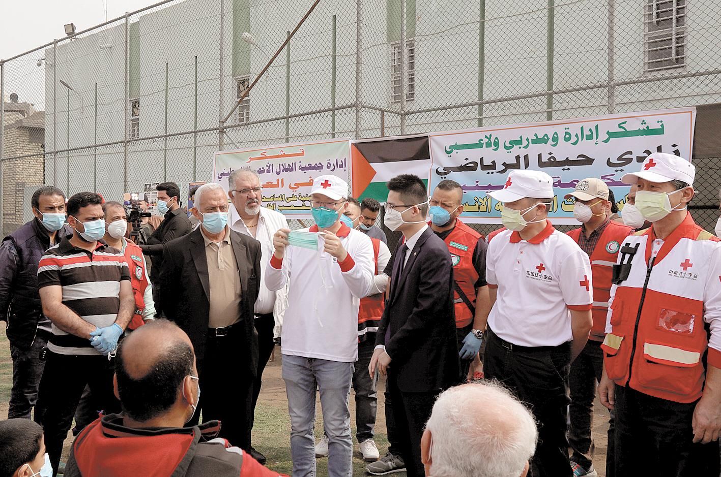 3月16日,在伊拉克巴格达东部的海法巴勒斯坦社区活动中心,中国专家演示口罩佩戴方法。(新华社发)