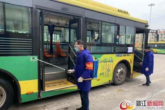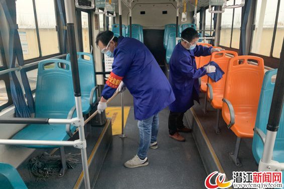 3月18日,在市公交总站,市楚道公交公司工作人员正在对公交车内外进行全面消毒。工作人员戴上手套,背上喷壶,手拿抹布和拖把,不放过任何死角。每一次擦拭和喷洒,都认真、到位。