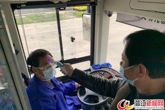 消毒结束,工作人员对公交车驾驶员和安全监督员进行体温检测,一切准备就绪后,正式发车。