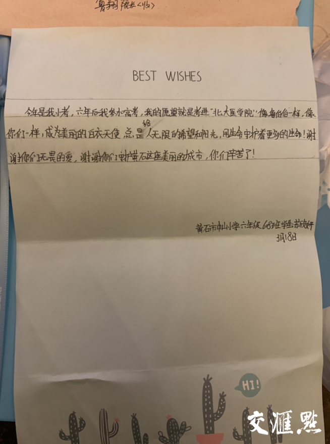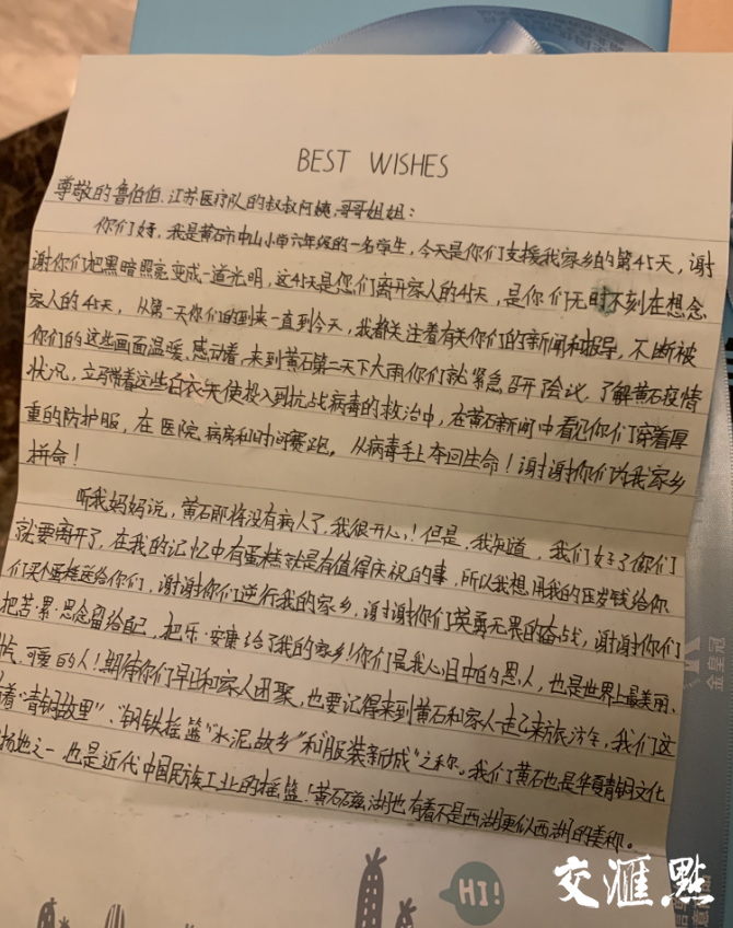 “苏欣妍同学的这封信,让我感动、鼓舞。”鲁翔说,这是一个孩子对社会的理解、对医生的理解、对江苏医疗队援黄石所尽义务的理解,“这更加说明我们的到来是值得的,是很有意义的。”