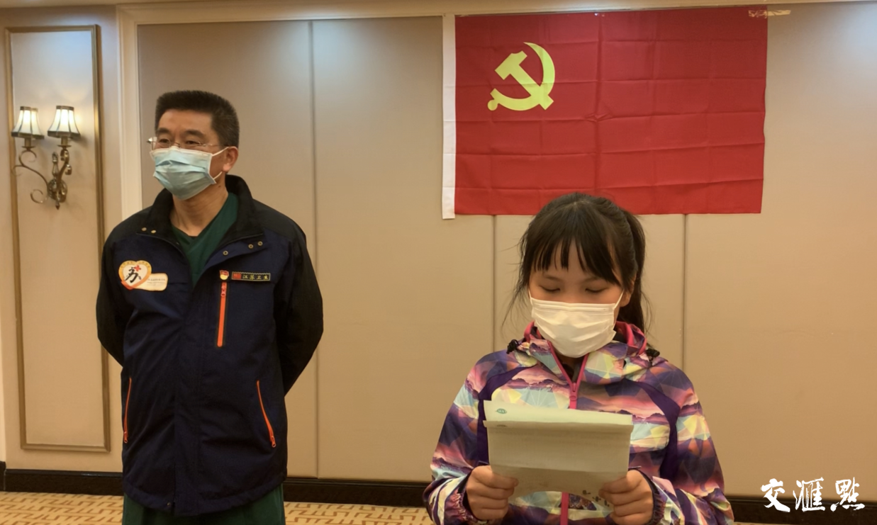 “在黄石的新闻中,看见你们穿着厚重的防护服,在医院病房和时间赛跑,从病毒手上夺回生命!谢谢你们为我家乡拼命!”3月18日晚7点,一位小学生应邀在江苏援黄石医疗队临时党总支新党员入党宣誓仪式上,宣读了一封她写给“医疗队哥哥姐姐”和江苏援黄石医疗队总领队鲁翔“鲁伯伯”的信。