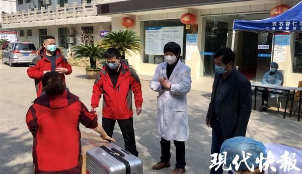 现代快报讯 (特派记者 孙玉春 / 文 王光强 / 摄) 3 月 18 日上午,江苏援黄医疗队三名队员带着一批防疫物资,赶往黄石市普仁医院,将一份心意和祝福送给共同奋斗的同仁。