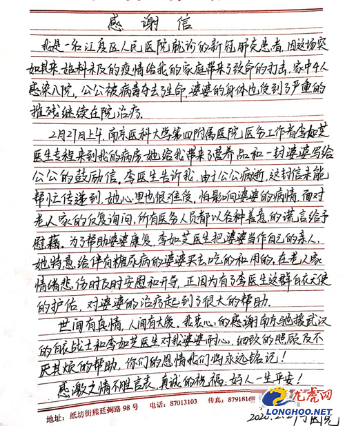对于有的患者而言,自己出院后便与曾经治疗过自己的医生失去了联系,无法将自己的感谢信亲手交到医护人员手中。然而,这并不能阻挡患者写信感谢医务工作者的心愿。在武汉江夏区第一人民医院,一位重症患者因为特殊原因无法得到曾经负责治疗自己的南京市江宁医院呼吸与危重症医学科医生柯章敏等人的联系方式,出院后也难掩自己的感激之情。在给江苏省第一批援汉医疗队写下一封深情的感谢信后,这位患者通过层层关系将这封信送到了江夏区第一人民医院。虽然是非手写的电子文档,但深切的话语依然柯章敏和同事们感到自豪和欣喜。
