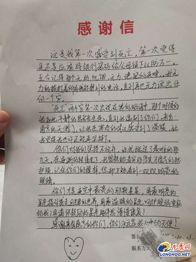 龙虎网讯 (记者 陶禹歌 张璐)“感谢来自南京的你们,你们永远是我心中的天使。”“你们才是夜空中最亮的那颗星星,用最温暖的星光呵护脆弱重病的我”......在抗疫一线,不少患者在得到来自南京的医疗队员的救治后,纷纷用自己的方式来感激医务工作者的付出。在武汉某个方舱医院内,几十位患者还在集体向来自南京的医护人员献唱《爱的奉献》后,将二十多封感谢信交到他们手中。这些感谢信,承载着患者对于医护人员的感恩,也镌刻着医护人员对于患者尽心尽职的付出。