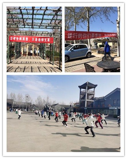 ▲回归的天津医疗队驻地标语和队员们在领队陆伟的带领下练习八段锦