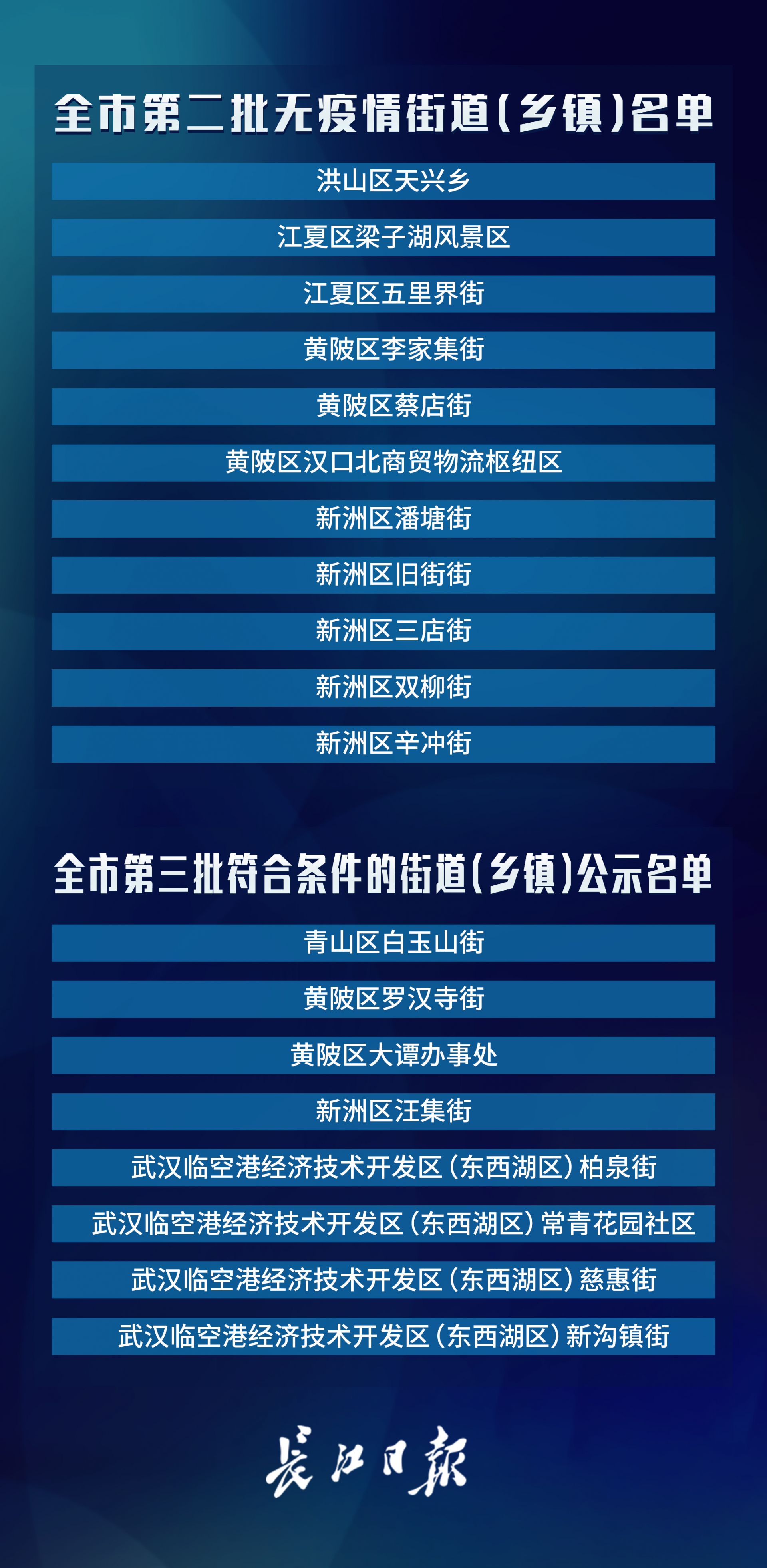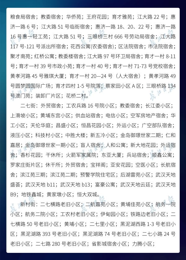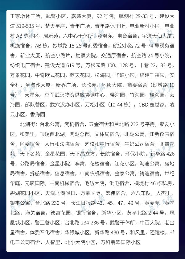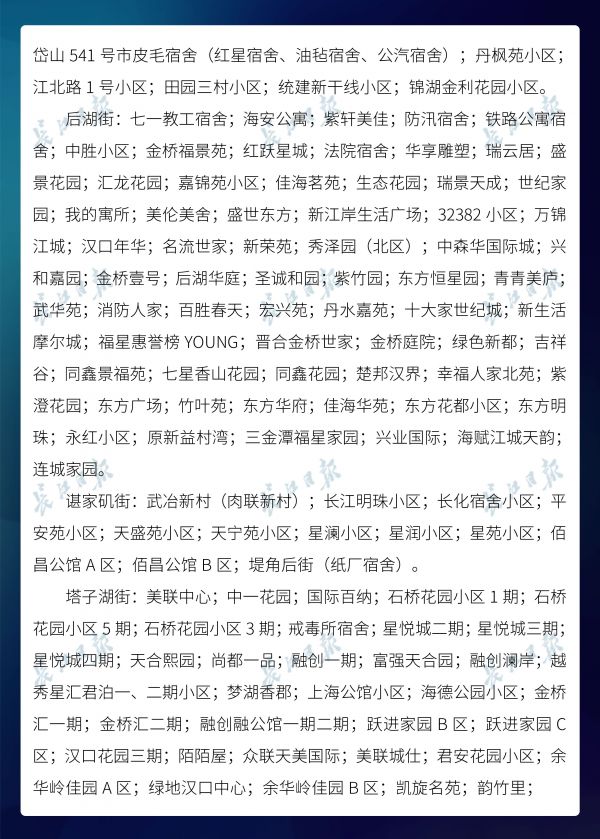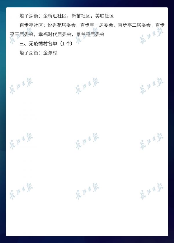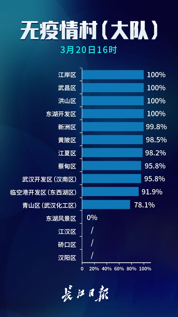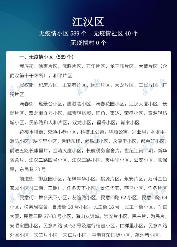 长江日报-长江网3月20日讯3月20日,武汉市新冠肺炎疫情防控指挥部社区疫情防控组公布全市第六次评定的无疫情小区、社区、村(大队)名单,命名第二批11个无疫情街道(乡镇)。截至3月20日16时,武汉已命名无疫情街道(乡镇)21个,洪山区天兴乡是中心城区首个无疫情街道(乡镇)。