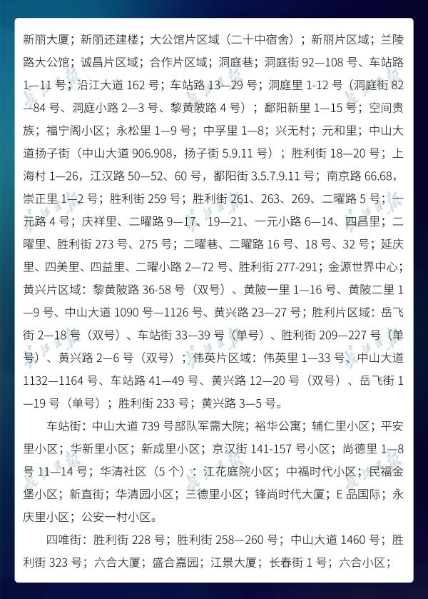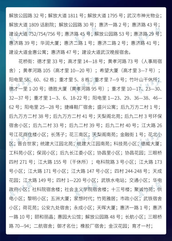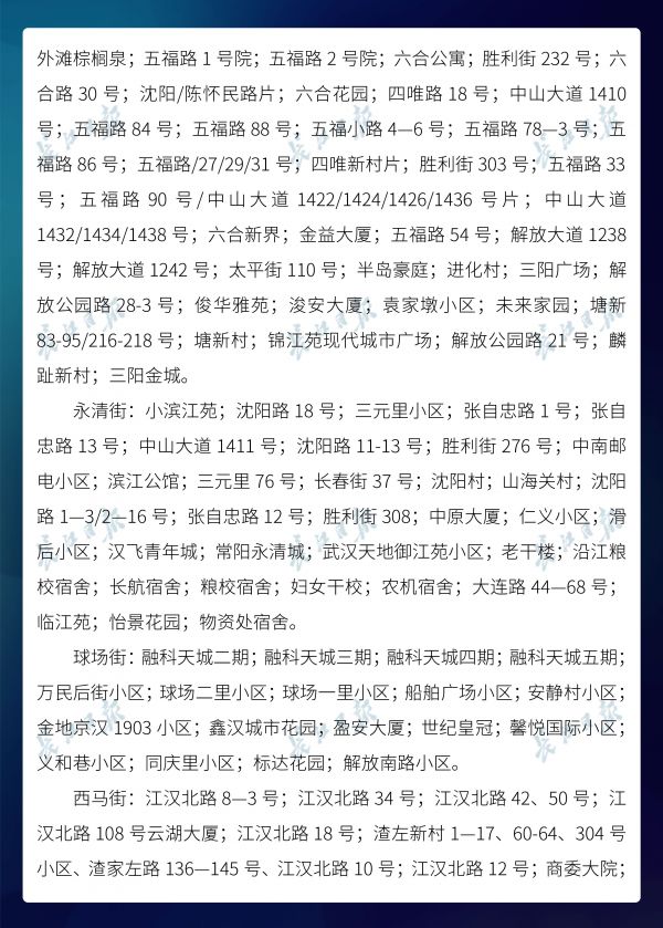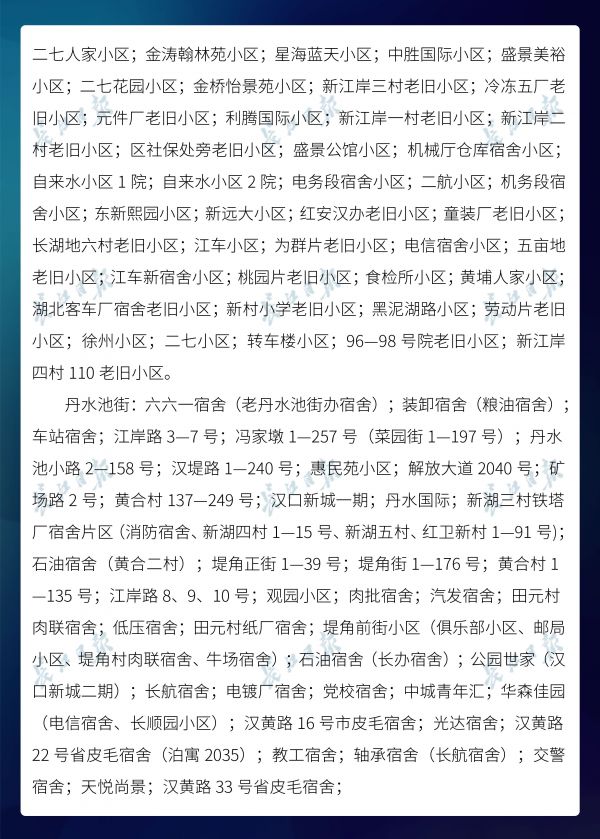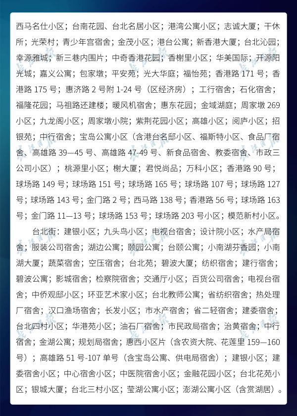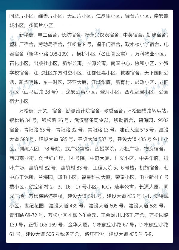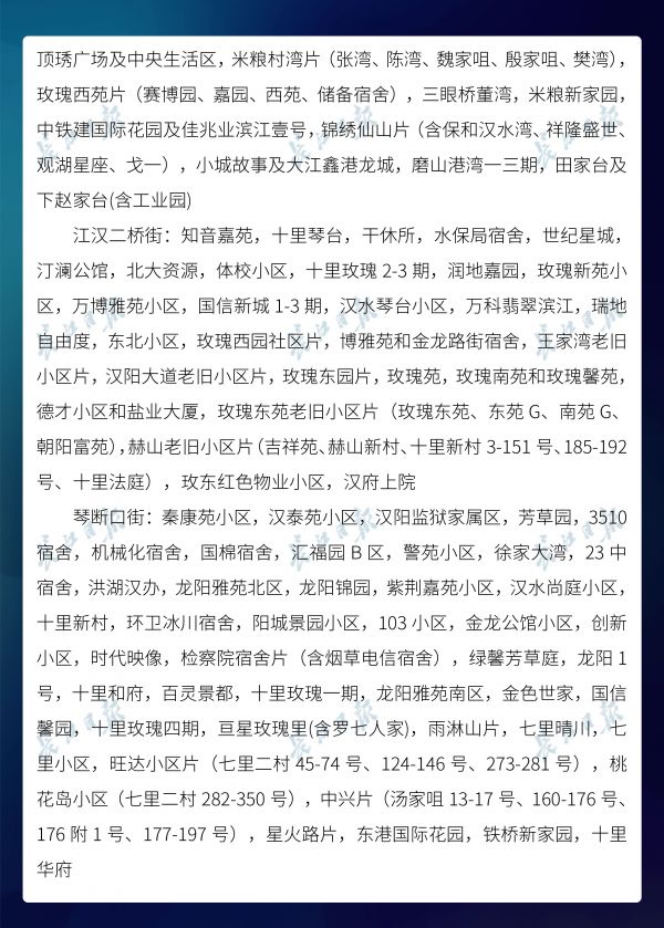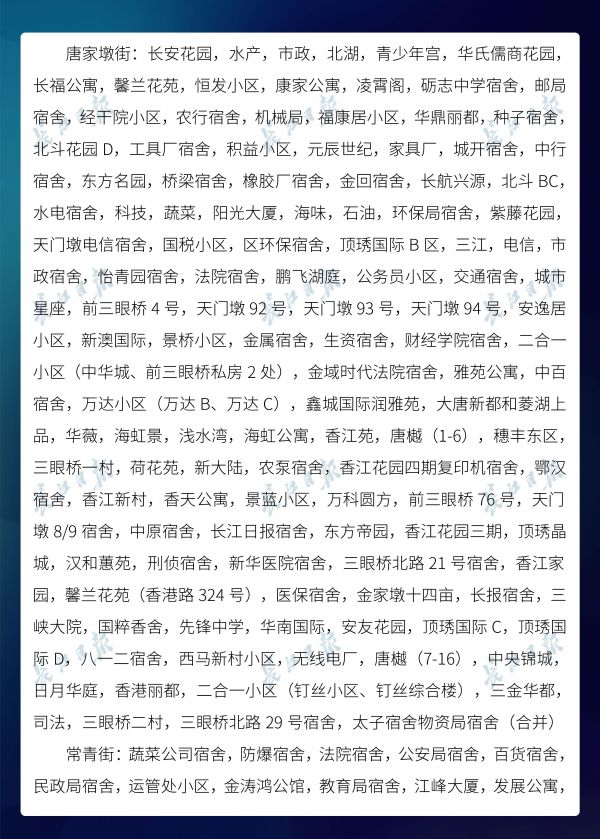 长江日报-长江网3月20日讯3月20日,武汉市新冠肺炎疫情防控指挥部社区疫情防控组公布全市第六次评定的无疫情小区、社区、村(大队)名单,命名第二批11个无疫情街道(乡镇)。截至3月20日16时,武汉已命名无疫情街道(乡镇)21个,洪山区天兴乡是中心城区首个无疫情街道(乡镇)。