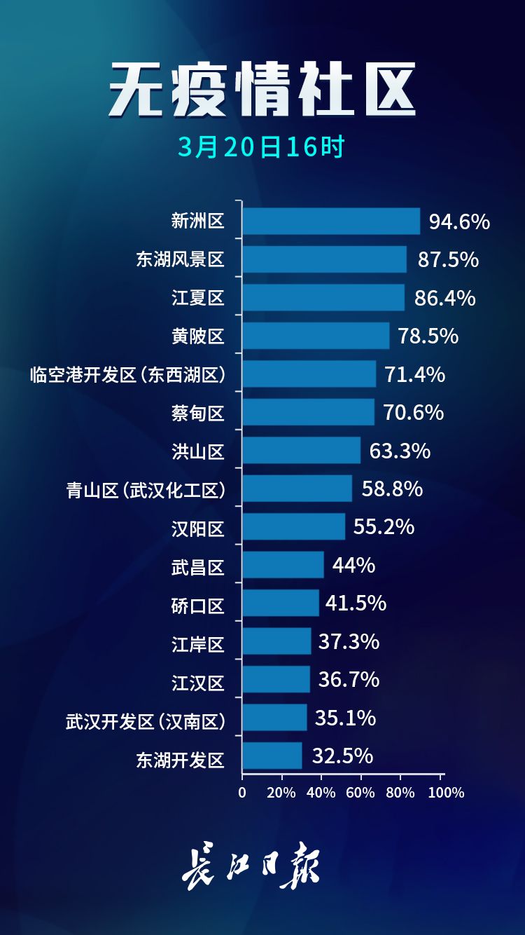截至3月20日16时,全市无疫情小区累计数量6302个,占比88.7%;无疫情社区累计数量775个,占比55.1%;无疫情村(大队)累计数量1900个,占比97.8%。