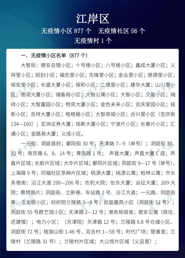 经各区第六次评定,全市无疫情小区新增728个,无疫情社区新增231个,无疫情村(大队)新增59个。同时因疫情变化核查处理,少数无疫情小区、社区、村(大队)被取消或暂停。