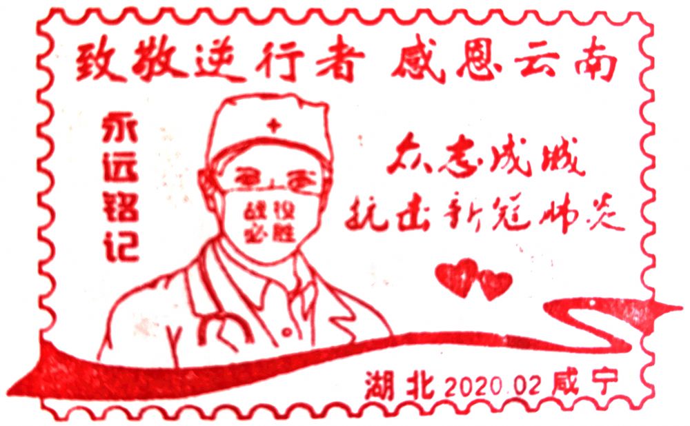云南省对口支援咸宁市。2月26日,咸宁邮政启用一款“致敬逆行者,感恩云南”宣传戳,向云南支援咸宁医疗队表达由衷敬意和感恩之情。该宣传戳的图案是一位坚毅的医护人员半身特写,口罩上特意加上“战疫必胜”四个字;两侧是“永远铭记”和“众志成城,抗击新冠肺炎”字样。