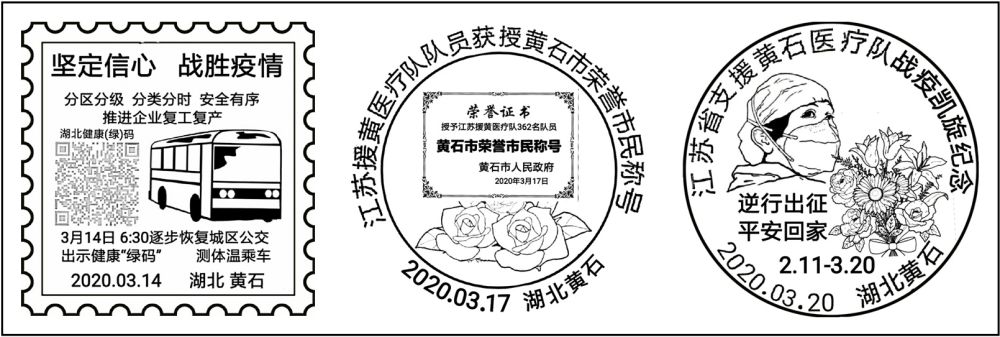 黄石邮政紧跟疫情防控工作发展脉络,及时启用一系列纪念戳:(1)3月14日,该市开始逐步恢复城区公交。黄石邮政特地启用一款以湖北健康绿码和公交车为图案的“坚定信心,战胜疫情——分区分级,分类分时,安全有序,推进企业复工复产”纪念戳,成为省内唯一带健康码图案的邮戳;(2)3月17日,黄石市政府决定授予江苏支援黄石医疗队362名队员“黄石市荣誉市民”称号。黄石邮政于当天启用一款该主题的纪念戳,图案为荣誉市民证书和象征坚韧不屈的月季花;(3)3月20日,江苏援黄医疗队凯旋回家。黄石市长吴锦、市人大常委会主任陈丰林等率黄石人民十里相送,“‘黄小石’感谢‘苏大强’”。黄石邮政于当天启用一款该主题的纪念戳,以一位医护人员毅然回眸的特写、“逆行出征,平安回家”文字和康乃馨、牡丹、菊花等为图案。
