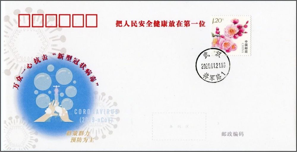 1月21日,党中央、国务院对新冠肺炎疫情防控工作作出全面部署。当天,武汉一帮铁杆邮迷设计制作了“万众一心,抗击新型冠状病毒”纪念封,贴上武汉市花“梅花”邮票,到离该市首家新冠肺炎定点救治医院——金银潭医院最近的将军路邮局盖上当天的日戳。这枚纪念封在第一时间用邮品的方式,记录下全国防控新冠病毒的重大行动和武汉收治新冠肺炎患者的最初情况。