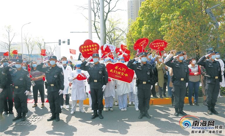3月20日,湖北省荆州市,海南支援湖北的第一批和第四批医疗队共248人开始返程,荆州市警察、医护人员手拉暖心横幅,行人驻足挥手,沿途执勤民警立正敬礼,送别海南白衣战士。海南日报特派记者 袁琛 摄