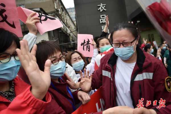 四川省第一批援鄂医疗队撤离武汉,武汉红十字会医院医护人员挥手道别。 记者 郭良朔 摄