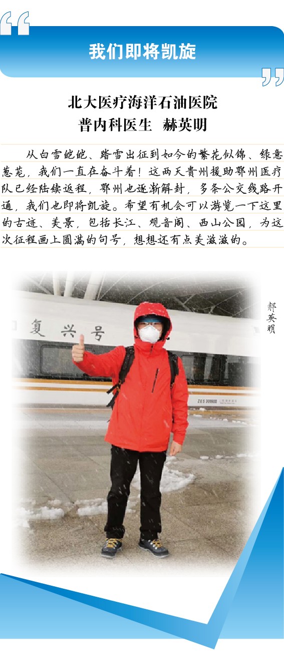 【编辑日记】从白雪皑皑时,踏雪出征,到如今繁花似锦、绿意葱茏,你们依旧在为抗击疫情努力奋斗着!小编向你们致敬!家里安好,这几天陆续回到家乡正在休整中的“战友们”也很好,他们也在盼着你们回来呢。目前,家乡的超市、公园、文化场馆、体育场陆续开放了,待你们归来之时,一定会更好。加油!我们等你们回家!