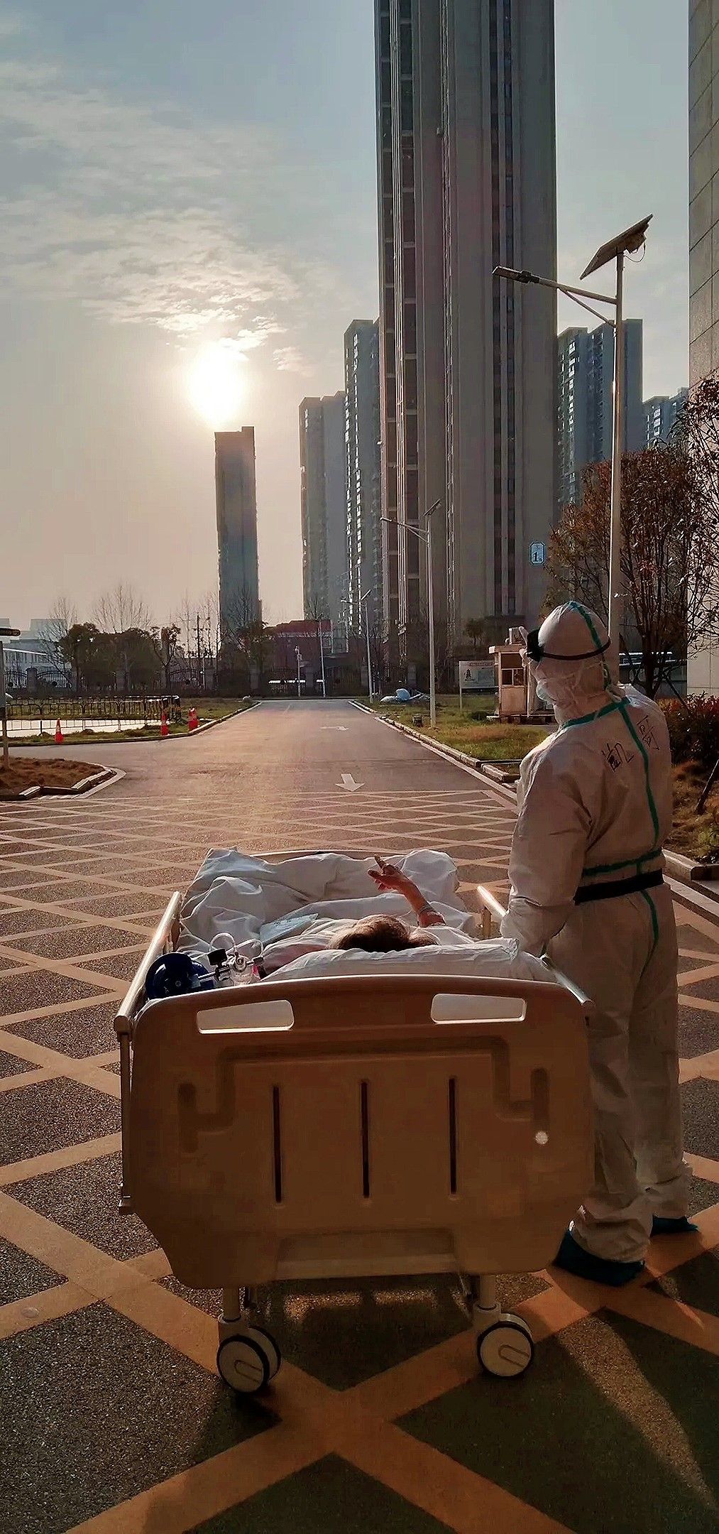 在武大人民医院的东院,复旦大学附属中山医院援鄂医疗队队员刘凯在护送病人做CT的途中,有意停下了脚步,为的是让已经住院近一个月的87岁的患者爷爷看看高挂天际的太阳。转运车上趟着的这位新冠肺炎患者,已经一个月没看到太阳了。照片中,90后医生刘凯,同这位患者一起举起右手,指着太阳,似乎还在交流着。我想,他们指着的,分明就是照耀生命的希望之光,他们交流的,一定是争取活下来的心愿!