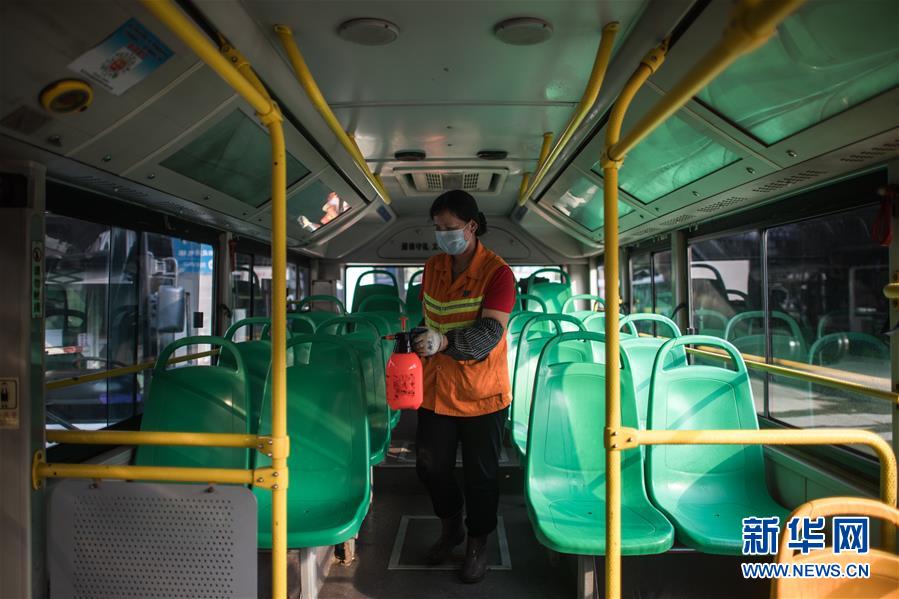 3月23日,在武昌火车站公交车总站,武汉公交集团站务公司保洁员赵真香在为一辆公共汽车消毒清洗。 新华社记者 肖艺九 摄
