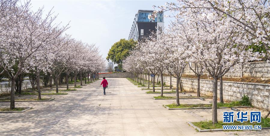 3月19日,在武汉市武昌区被网友称为“武汉最美停车场”的湖北日报停车场,一名工作人员从樱花树边经过。 进入3月中旬,武汉气温渐升,武汉市各处樱花次第开放。 新华社记者 才扬 摄