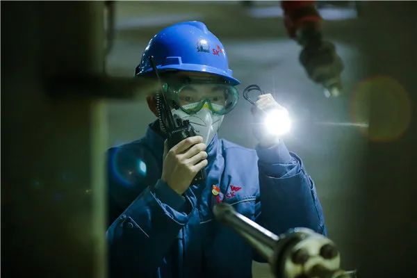 中韩石化有限公司在做好全员疫情防控的同时,千方百计确保安全环保生产,努力保供市场需求。图为中韩石化有限公司操作人员在现场认真巡检。(武汉市青山区纪委监委供 付松 摄)