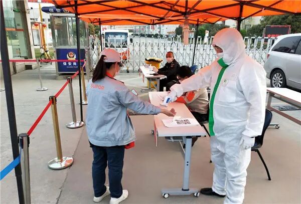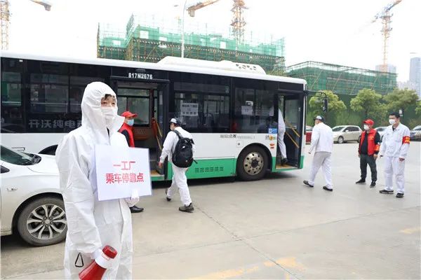 苏泊尔武汉基地工作人员正在对乘坐“点对点”“一站式”返岗暖心专车返回复工的工人们测量体温,做好健康登记。(武汉市汉阳区纪委监委供 汪明星 摄)
