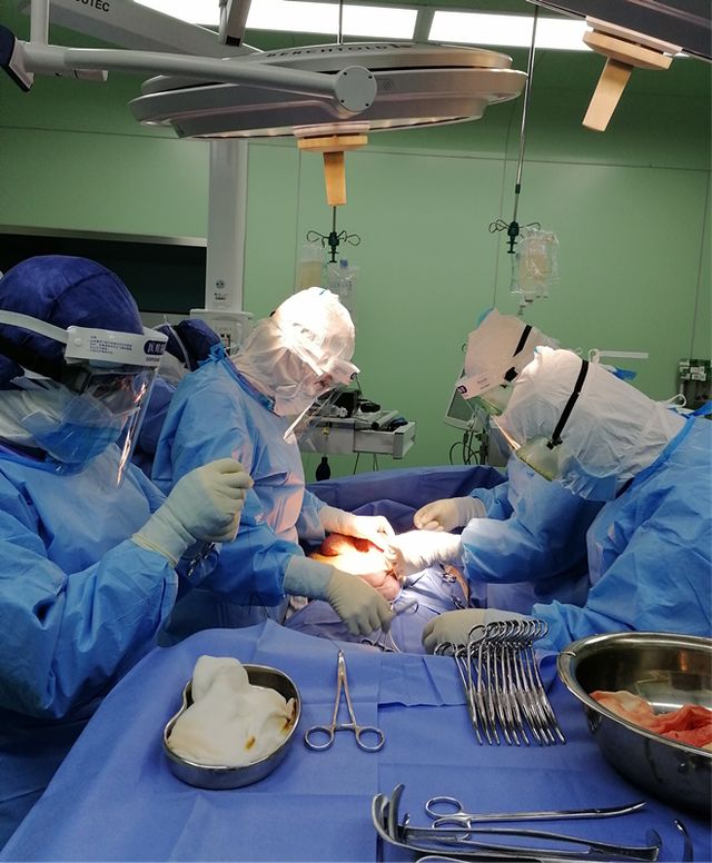 胃肠外科高金波教授、麻醉手术科肖主任、护士在急诊手术中。