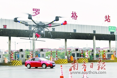 位于佛山的罗格收费站,无人机“上岗”助力防疫安全提醒。南方日报记者 戴嘉信 摄