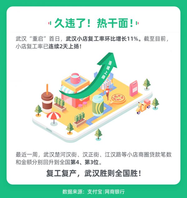 值得一提的是,最近一周,楚河汉街、江汉路、汉正街等小店街区在网商银行的贷款笔数上升到全国第4,贷款总金额为全国第三。这说明武汉小店正在为复工复产备战。