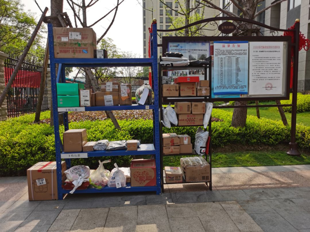 为了保证小区业主零接触收取快递,恒大御园物业在小区门口设置快递放置架,快递员将快递包裹放在快递架上。包元凯摄
