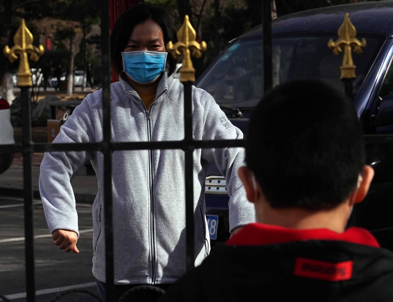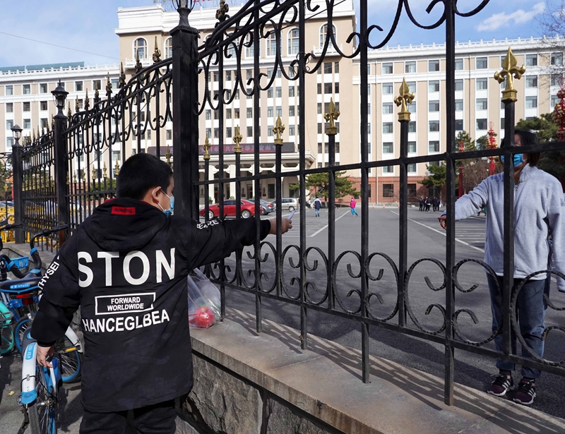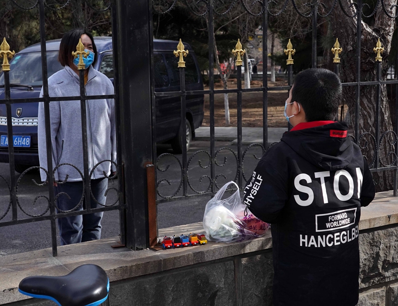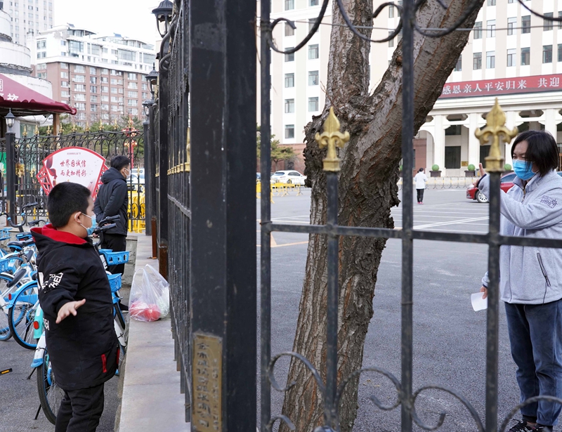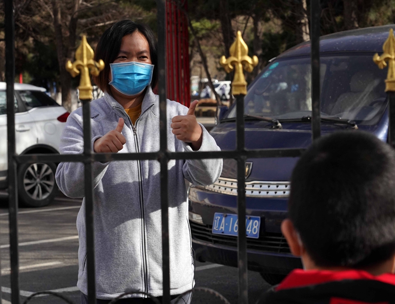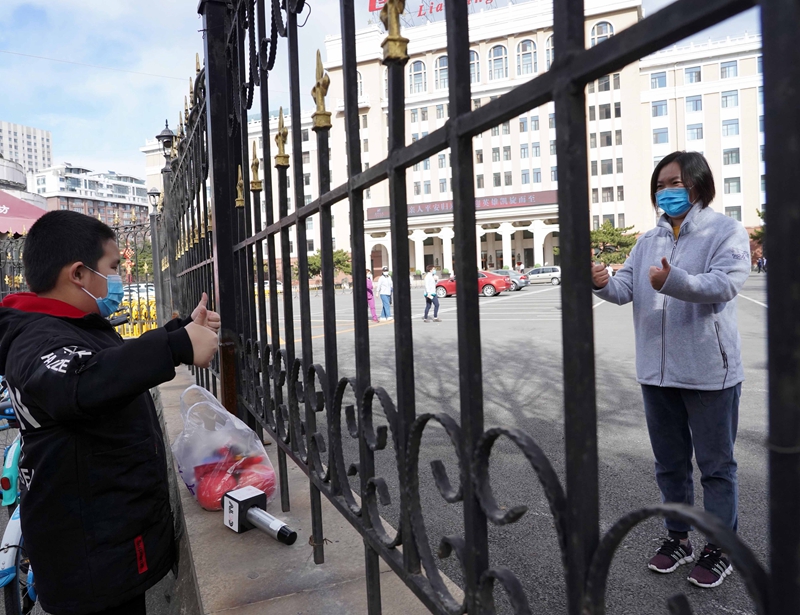 3月27日下午,在辽宁赴湖北医疗队队员隔离休整的辽宁大厦外,隔着围墙栅栏,保持一定的距离,王若彬在相约的时间里等来了他最想念的妈妈。