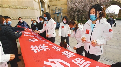 3月26日,我市支援湖北医疗队的部分医护人员与后勤厨师在隔离点重逢,大家在大红横幅上签下自己的名字,感谢全社会的关心与帮助。记者 赵建伟 姚文生 摄