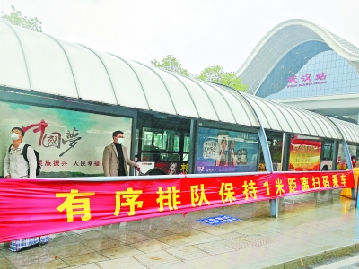 3月27日15时许,武汉站公交枢纽站,乘客正有序排队候车