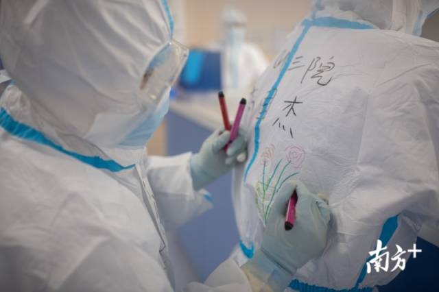 中山三院医疗队队员在队友的防护服上画画,彼此加油鼓劲