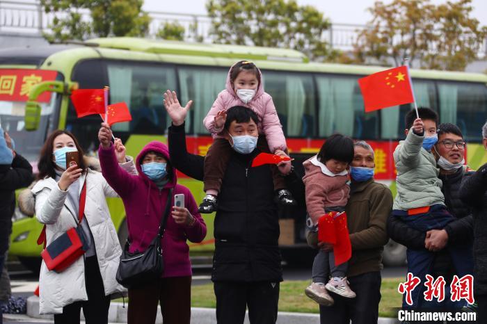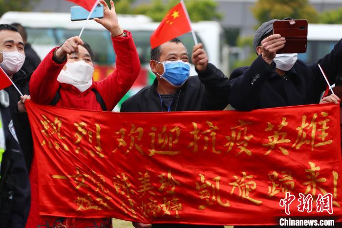 图为家属举着五星红旗欢迎白衣战士归来。 刘占昆 摄