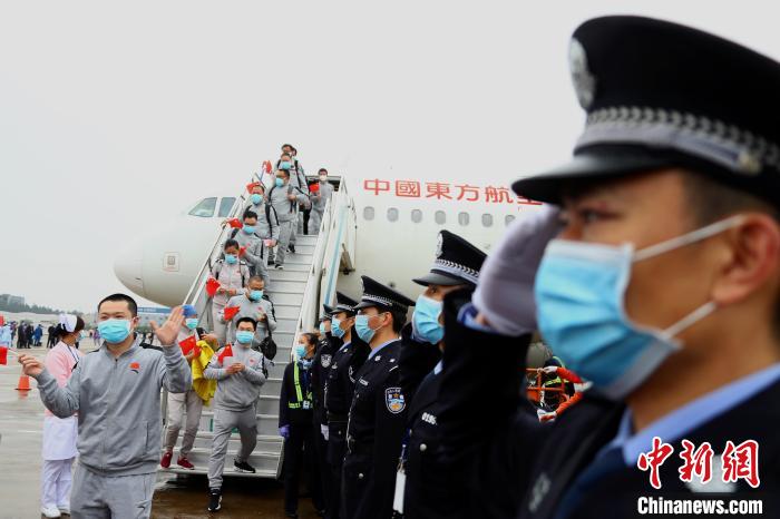 图为凯旋而归的医护人员走下飞机,警察列队敬礼致意。 刘占昆 摄