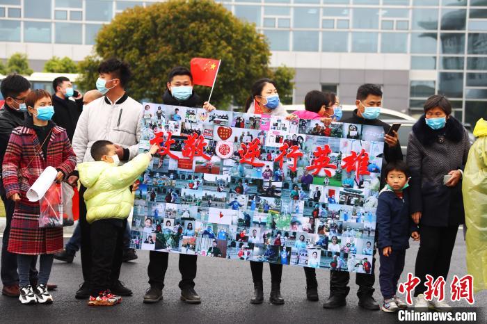 图为亲朋好友手拿贴满照片、写有致敬逆行英雄的照片墙,欢迎白衣战士归来。 刘占昆 摄