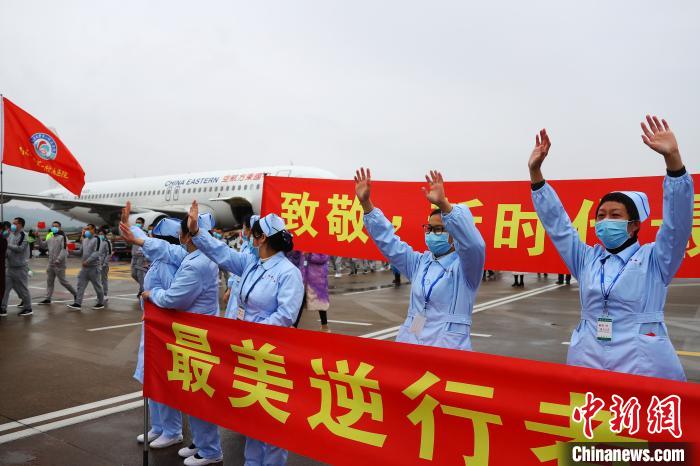 图为前来迎接的医护人员向凯旋而归的白衣战士致意挥手。 刘占昆 摄