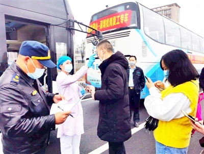 检查身份信息、核验健康绿码、监测体温、消毒……在现场工作人员的组织下,所有返岗复工人员有序上车。