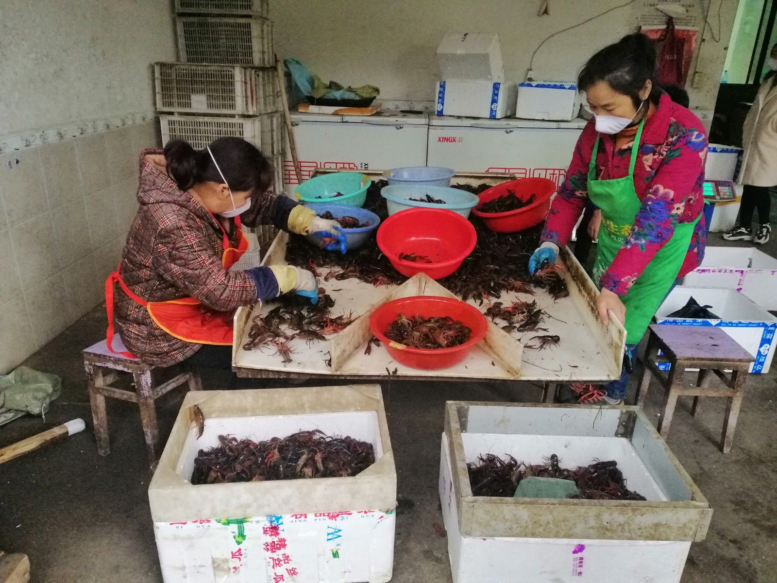 在官塘驿镇泉口村神泉湖种养殖专业合作社,负责人童聪正在忙着将收购来的小龙虾进行等级分拣打包,准备发往全国各地。该合作社现在每天小龙虾成交量3000斤左右,高峰期保持在1.5万斤,主要销往江浙沪粤。