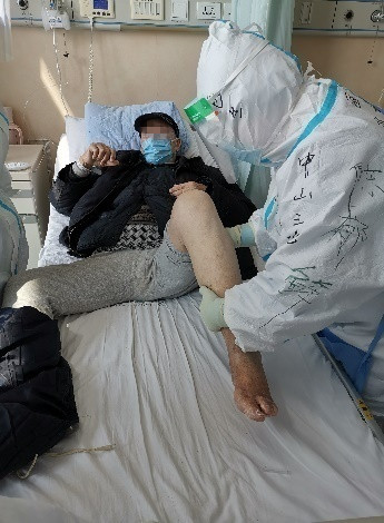 前线新冠肺炎的患者不乏合并骨病,骨质疏松、骨关节炎、骨坏死等屡见不鲜。陈郁鲜不仅处理我们自己病区的骨科疾病,还多次受邀前往其他病区诊治骨科相关疾病,在有限的条件下帮助患者缓解病痛,替友邻团队分忧解难,和其他病区建立起深厚的战斗友谊。