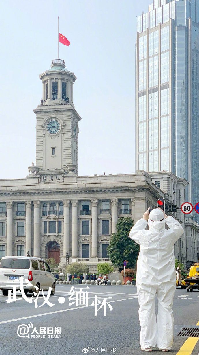 【#武汉市民拍摄降半旗#】早上8点52分,武汉江汉关大楼前,一名普通武汉市民穿着防护服,来纪念这个特殊的日子,表达对逝者的缅怀。武汉不会忘记,中国不会忘记!