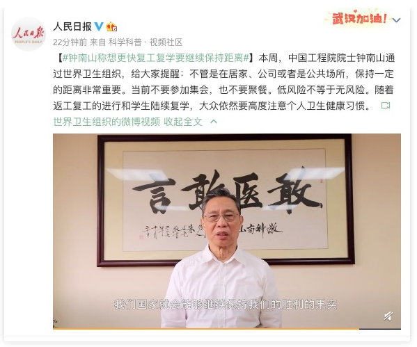 [大家好,我是钟南山。在这里我通过世界卫生组织向在屏幕中的你进行问候。我想我们2019冠状病毒病疫情,经过了三个月的努力,是得到了一定程度的控制。所以我们国家是从高危险区域进入到低危险阶段。当然了,低危险不等于没有危险。