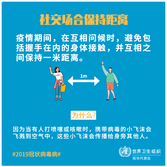 正如钟南山院士所强调的,社交场合保持一定的距离、不参加集会、不要聚餐是当前我们需要重视的。在互相问候时,应避免包括握手在内的身体接触;当互相问候或聊天时,互相之间保持一米距离。