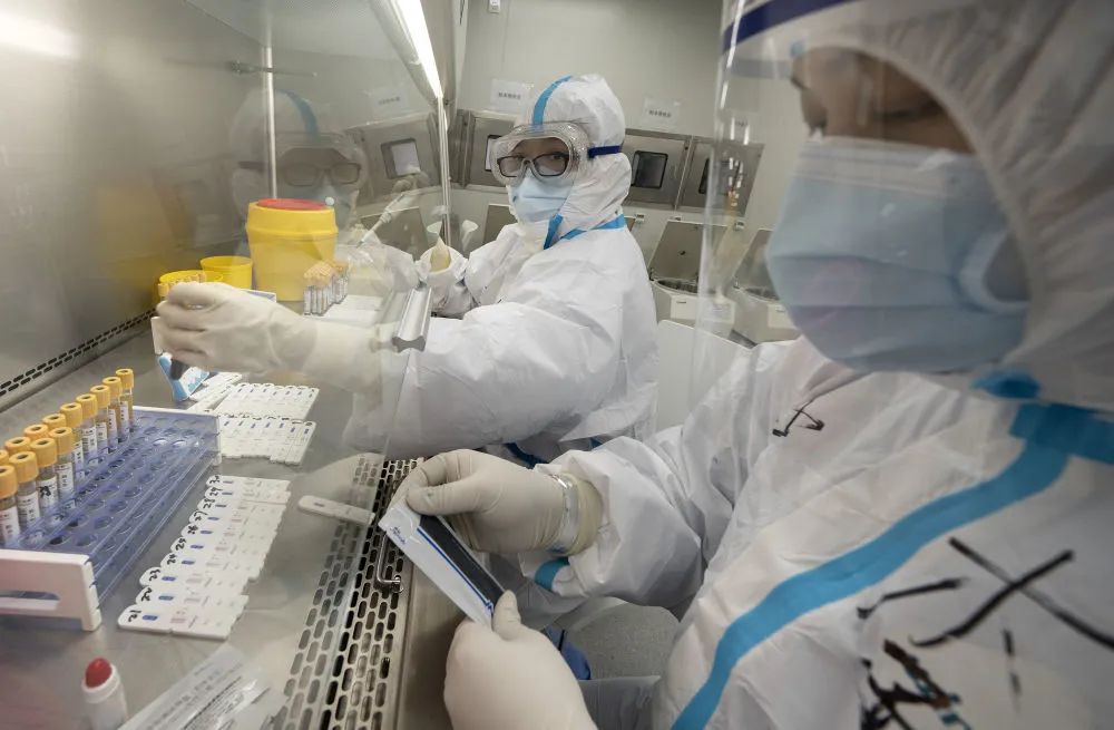 3月4日,在武汉雷神山医院医学检验科,工作人员在对患者的血液样本进行检测。