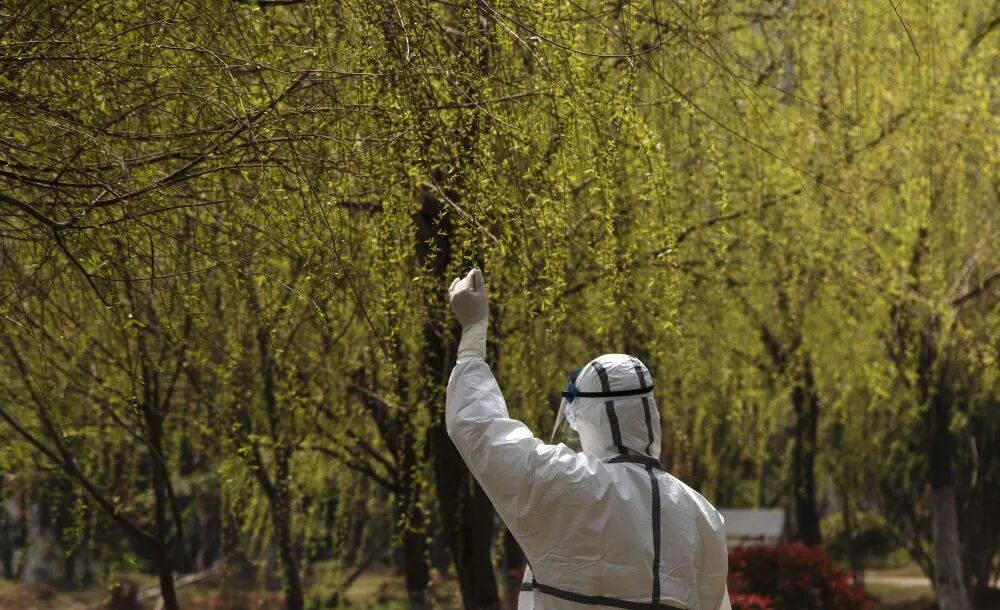 3月14日,在华中科技大学同济医学院附属同济医院光谷院区,负责新冠病毒肺炎患者转运的云南医疗队队员姚红军伸手触摸刚刚发芽的柳枝。