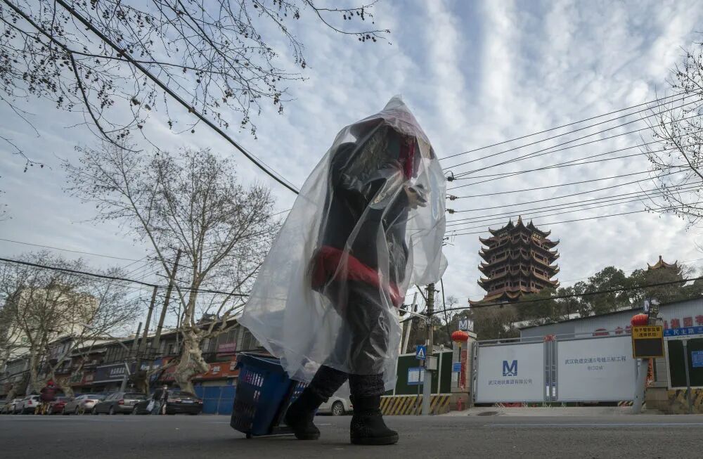 3月15日,一位身穿自制“防护服”的女士上街买菜时从黄鹤楼下走过。她说她近两个月来,只出过两次门。
