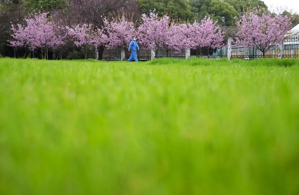 3月3日,一名工作人员从盛开的樱花树下走过。由于学校进行封闭管理,我在这几颗樱花树旁等了一个多小时,只遇到了两个人。