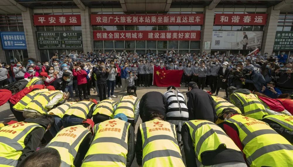 3月19日,在河南医疗队驻地,工作人员、志愿者和酒店职工鞠躬感谢即将踏上归程的河南医疗队成员。