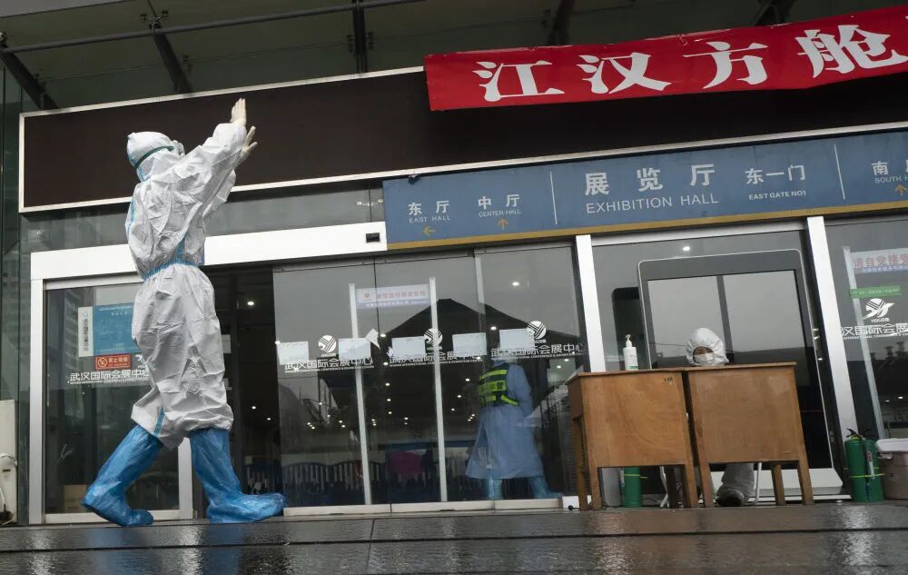 3月9日,最后一位走出江汉方舱医院的医护人员、武汉协和医院医生逯翀向方舱医院挥手告别。